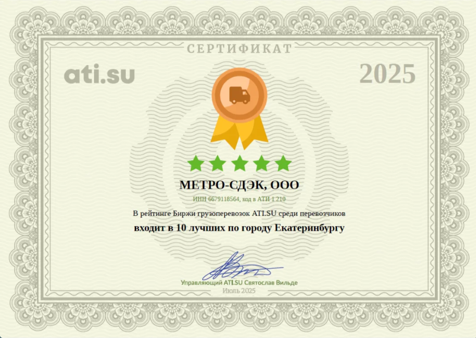 Мы рады сообщить: портал ATI.su официально подтвердил наше лидерство! Компания ООО "Метро-СДЭК" получила престижный сертификат и вошла в десятку лучших логистических операторов Екатеринбурга.